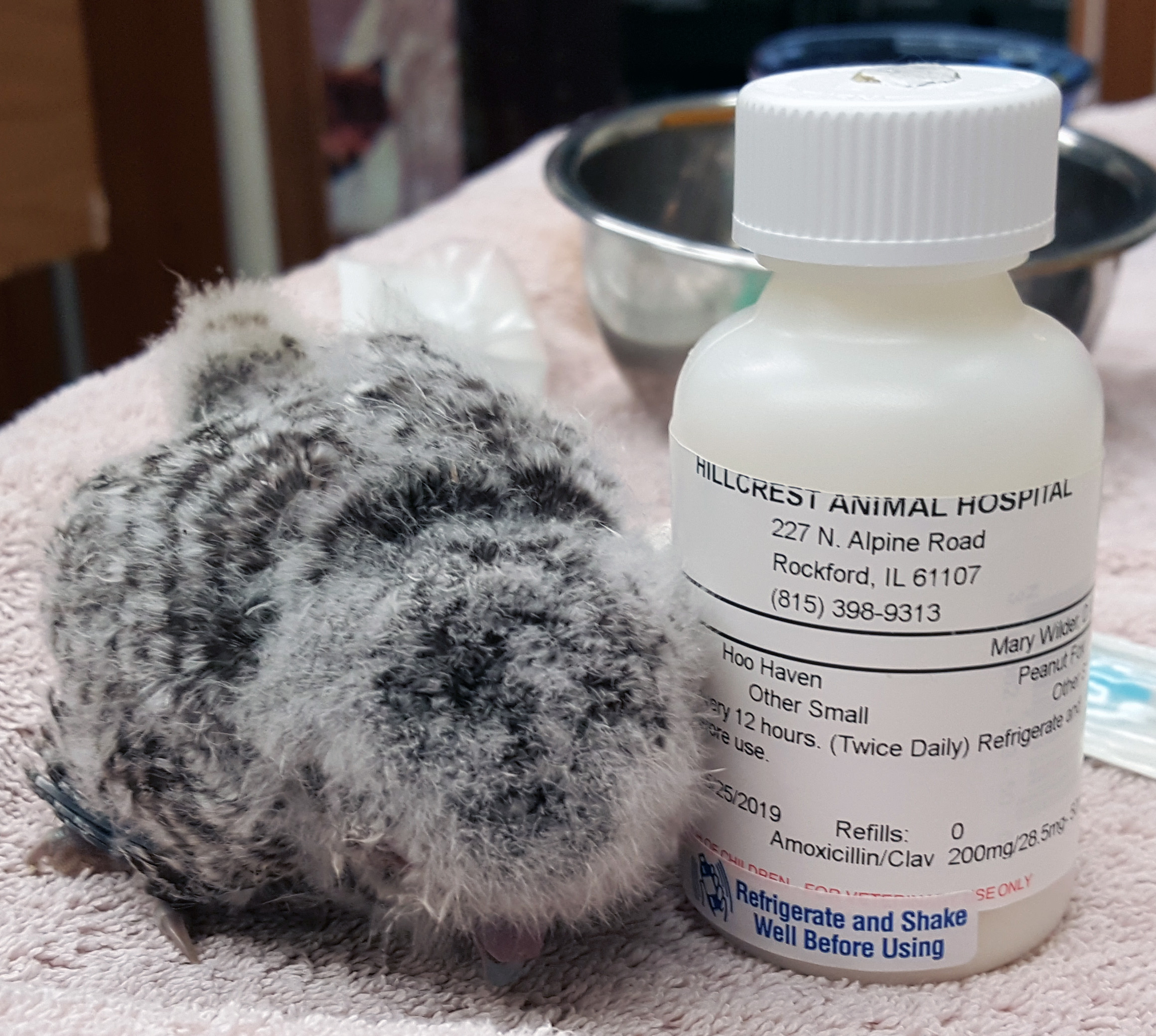 The officers called "Hoo" Haven Wildlife to ask if we thought we could help and take her. Of course we said yes. After getting her back to the facility, cleaning her massive wound and giving her injections and checking on the babies, we put her in an incubator to let her recover for a while. Over the next several weeks she was given good soft food , antibiotics and more so she could rest, but it was determined that the leg must come off. We had the leg surgically removed and left her with a stump for balance. Once again she was given medicine and pain medicine to make her comfortable while her babies continued to grow. Sweet Pea seemed to be doing well. She ate, sat up and seemed comfortable as that was our hope.